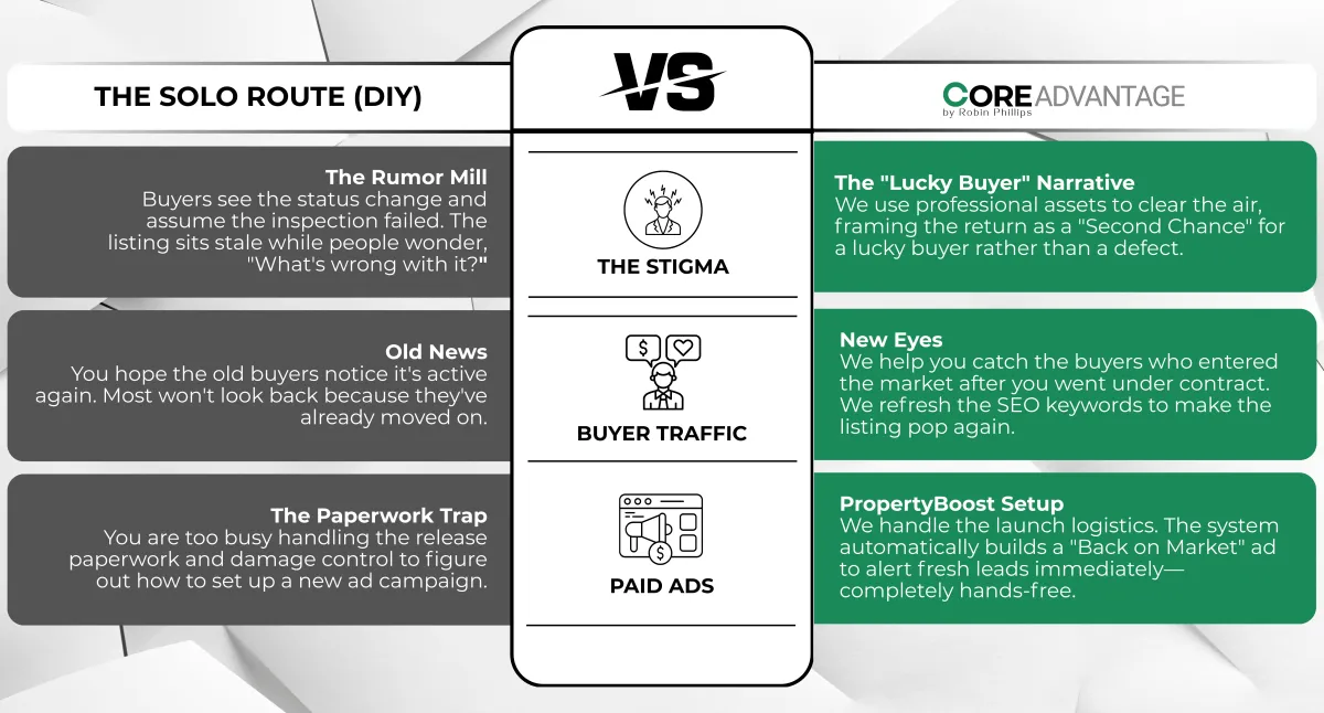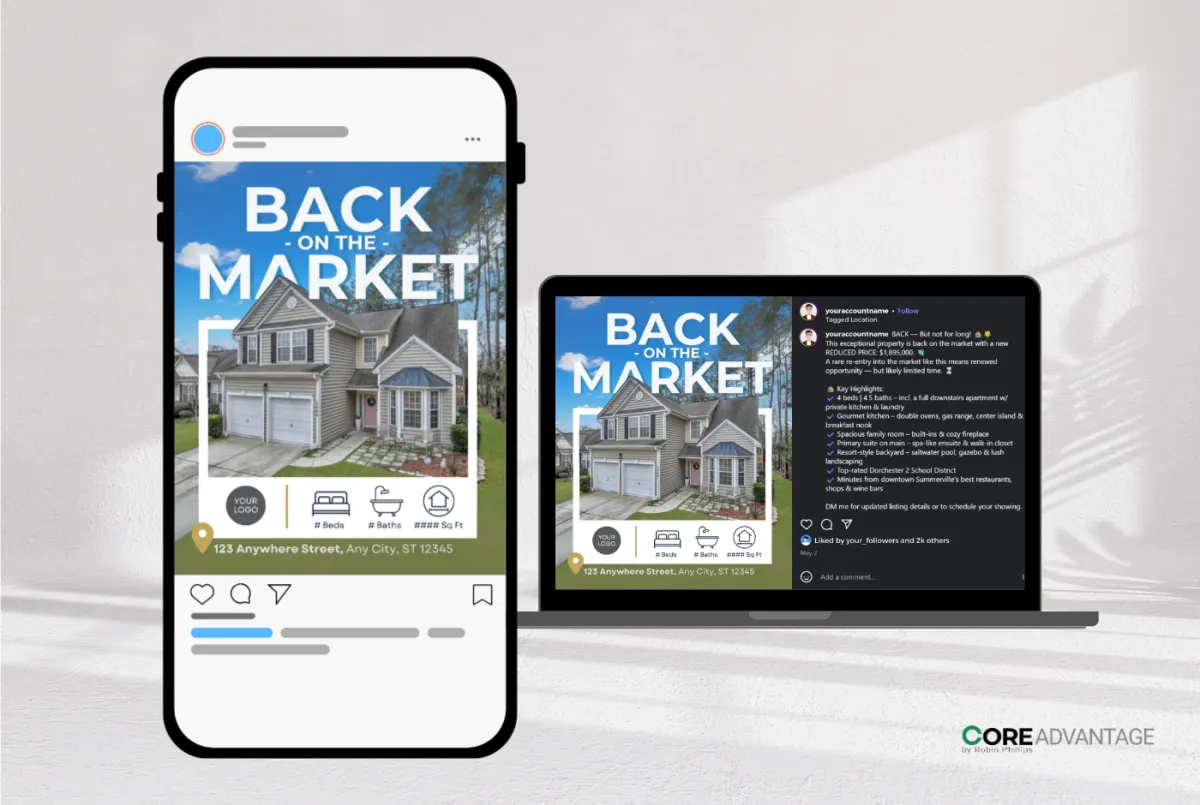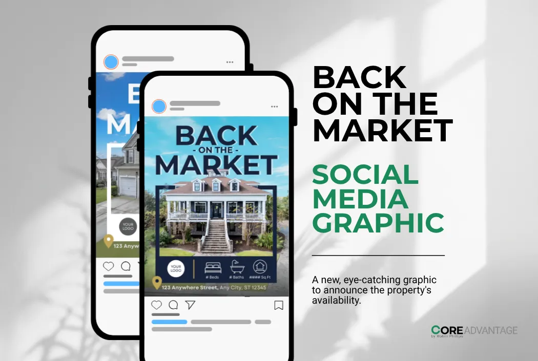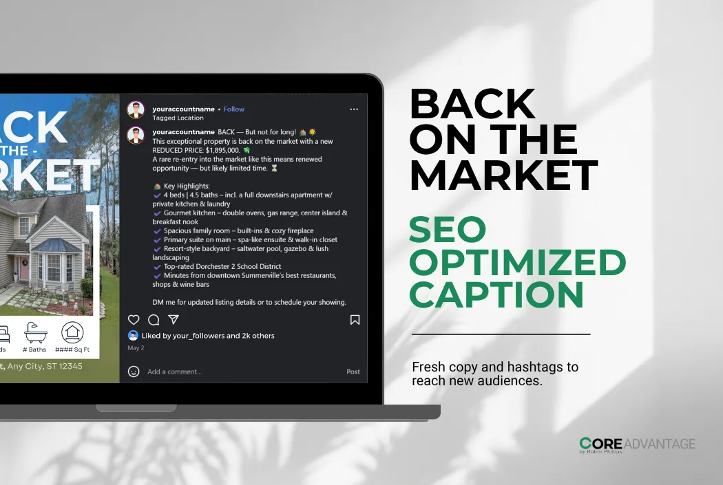 With this package: We design the "Back on Market" graphics and update your captions. If you choose to run ads, we also handle the PropertyBoost setup.